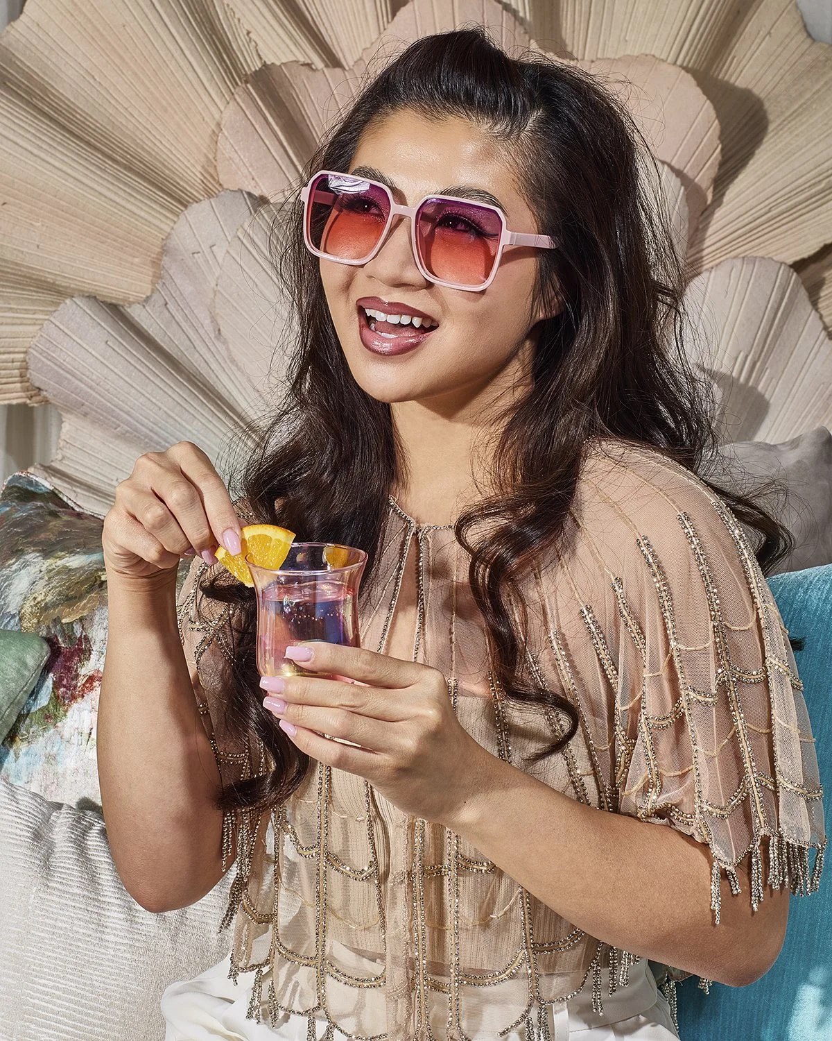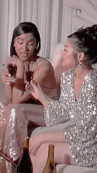 Two women clink glasses in this celebratory holiday cocktail party. Natalka Studio is a female lead, inclusive and sustainable product, still life and motion photography, directing and video studio in Los Angeles, California. Photographer and Directo