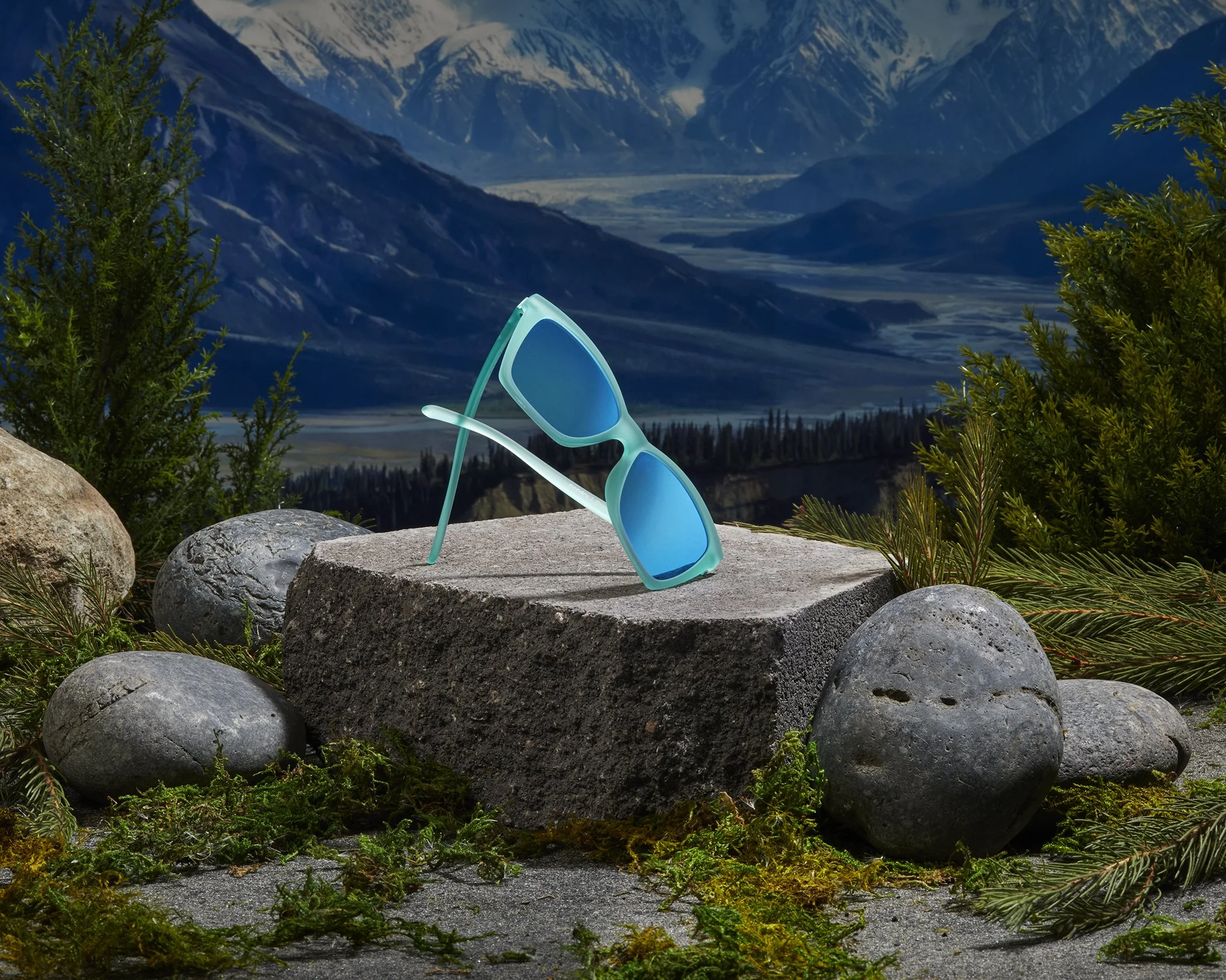 A sky blue sunglass on top of a rock, mountains in the background, urban landscape with green  and rocks. Advertising photography shoot in Los Angeles.