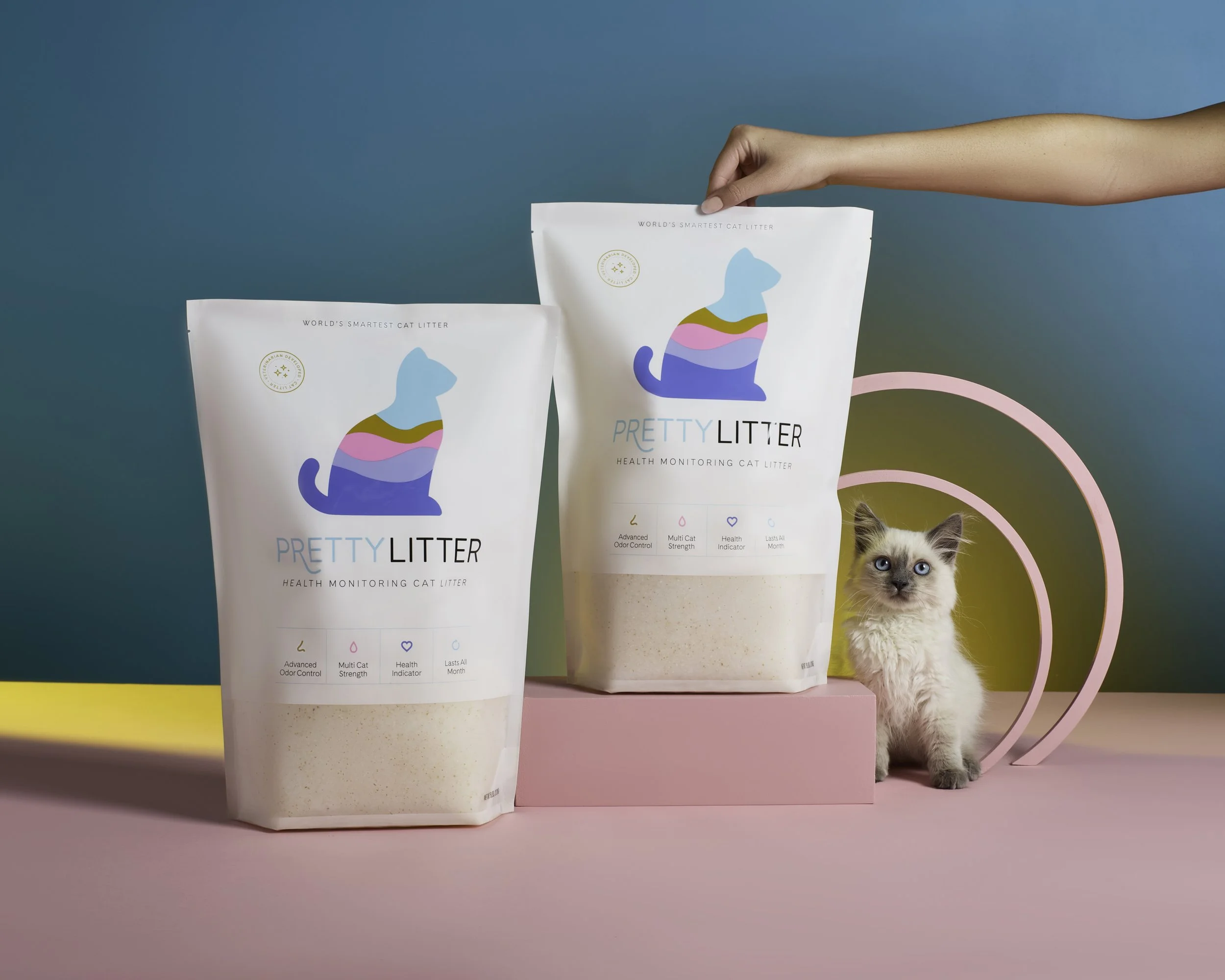 A person holding a bag of Pretty Litter, a cat litter product against a bright blue background. A cat sitting by the side. Sustainable product advertising photography shoot in Los Angeles. Natalka Studio.