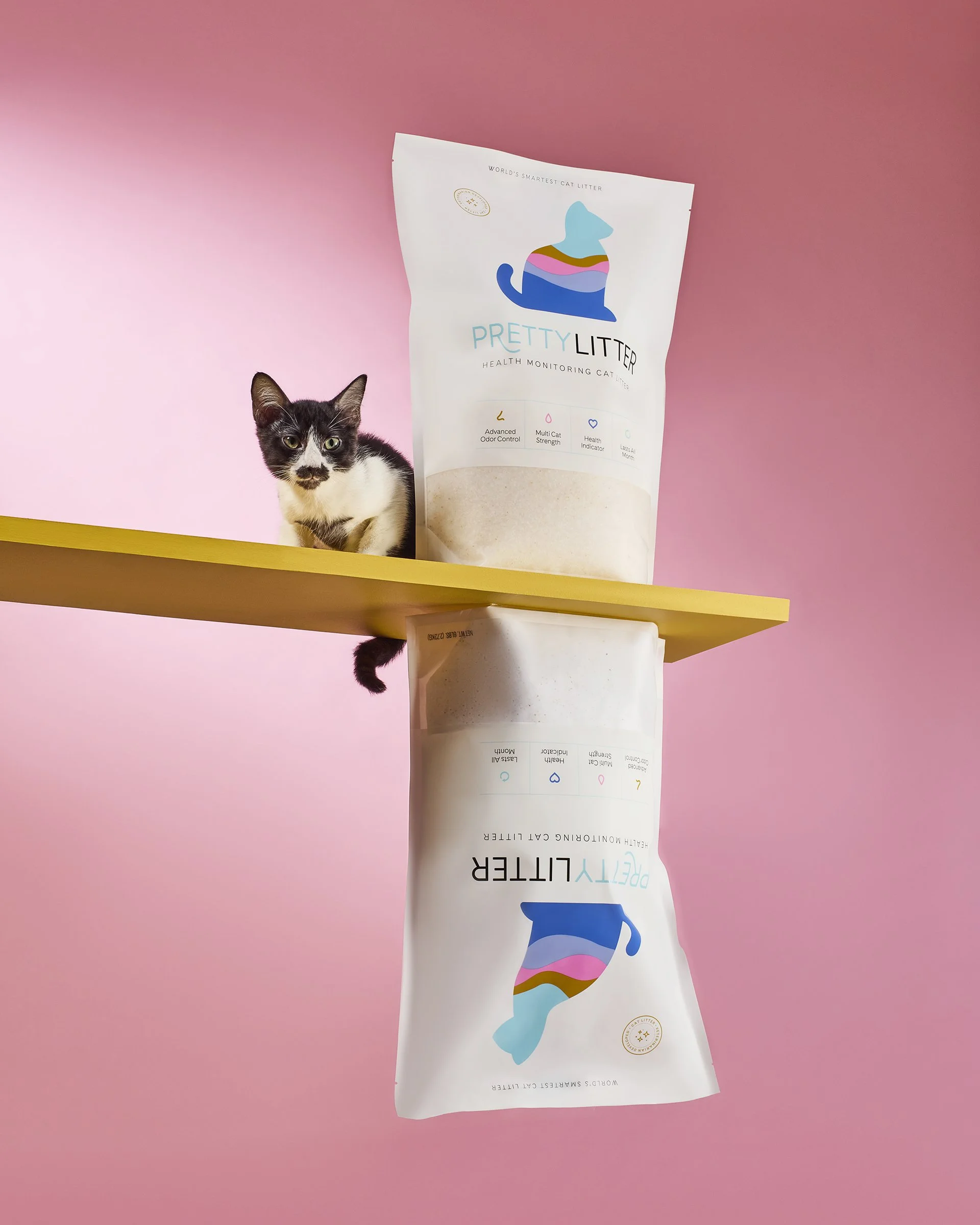 A calico kitten with white, black, and orange fur standing next to a bag of Pretty Litter cat litter on a blue background. Sustainable beverages advertising photography, director in Los Angeles. Natalka Studio View fullsize